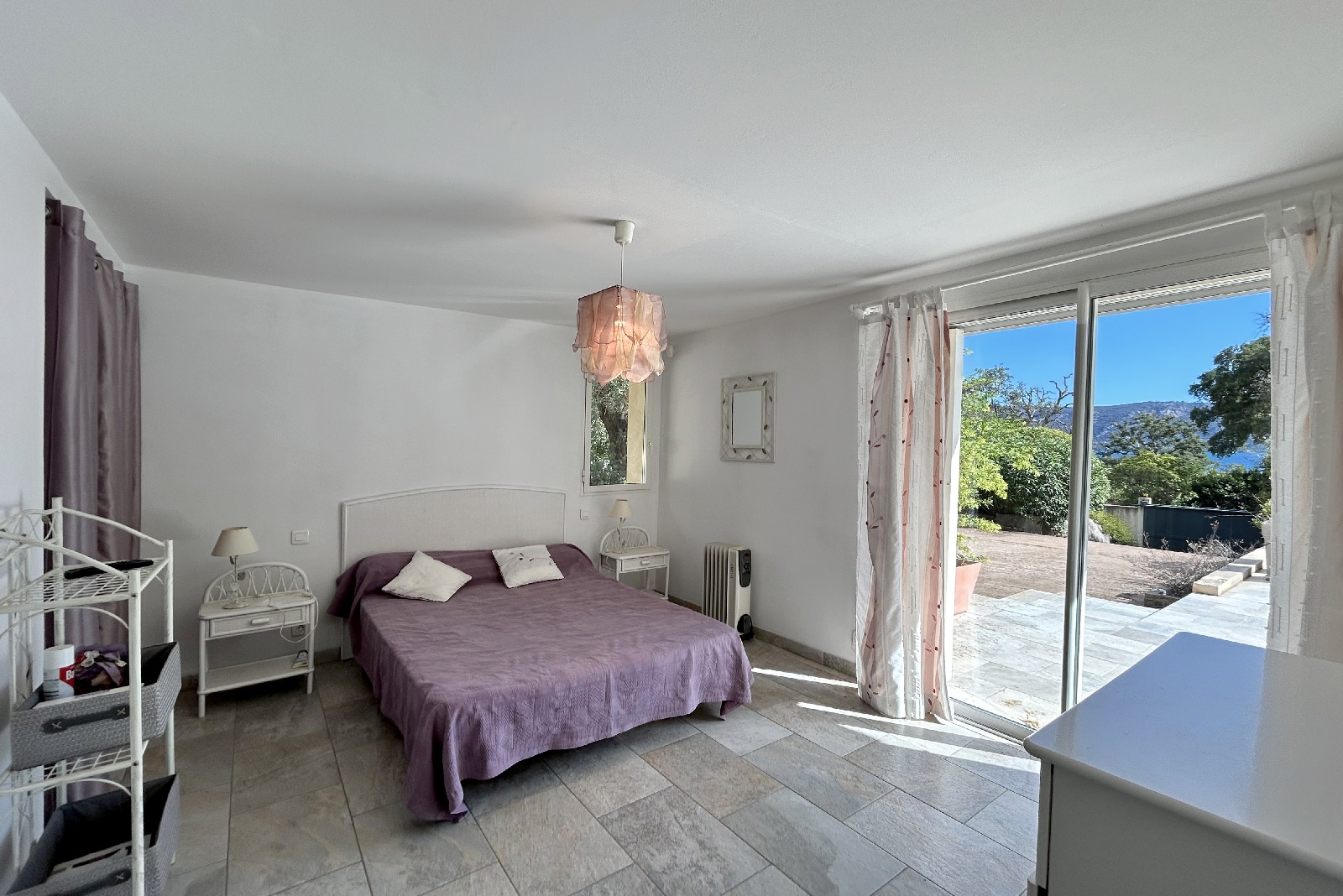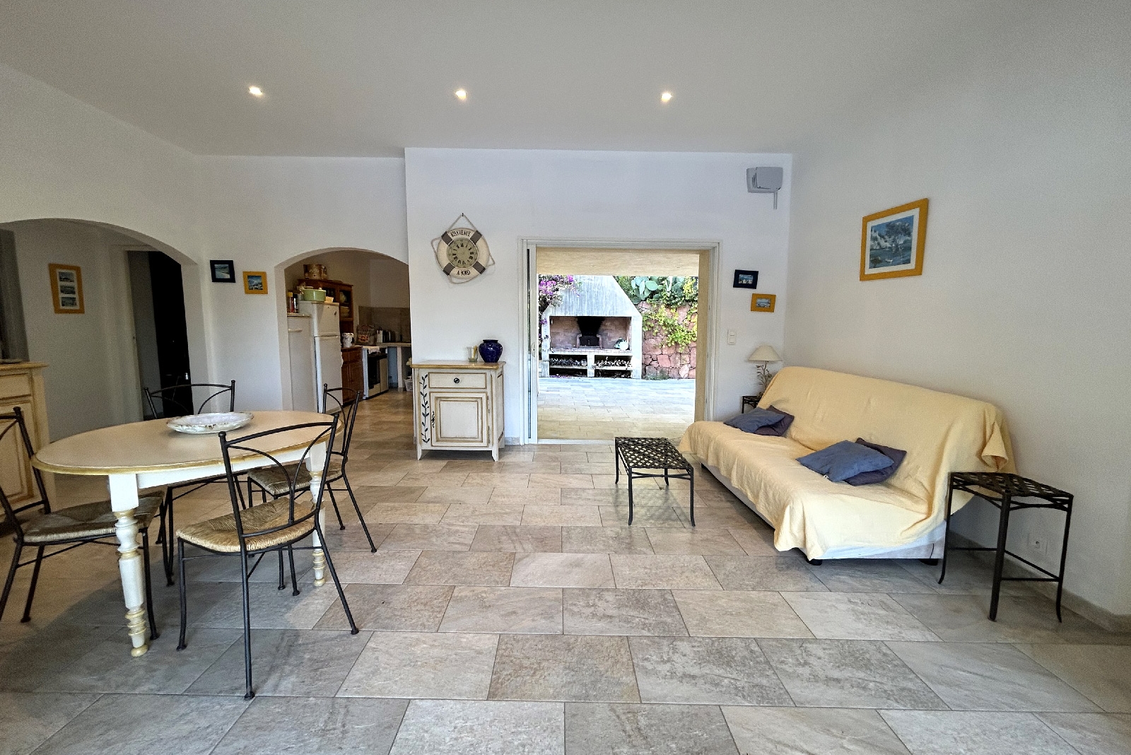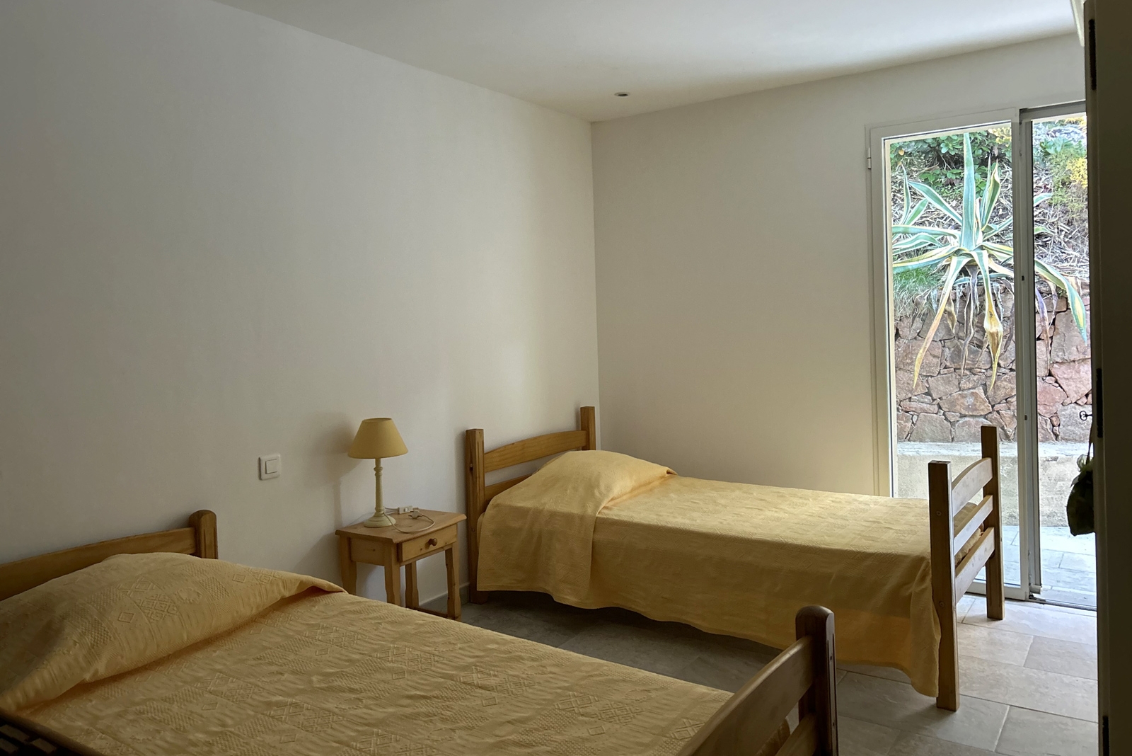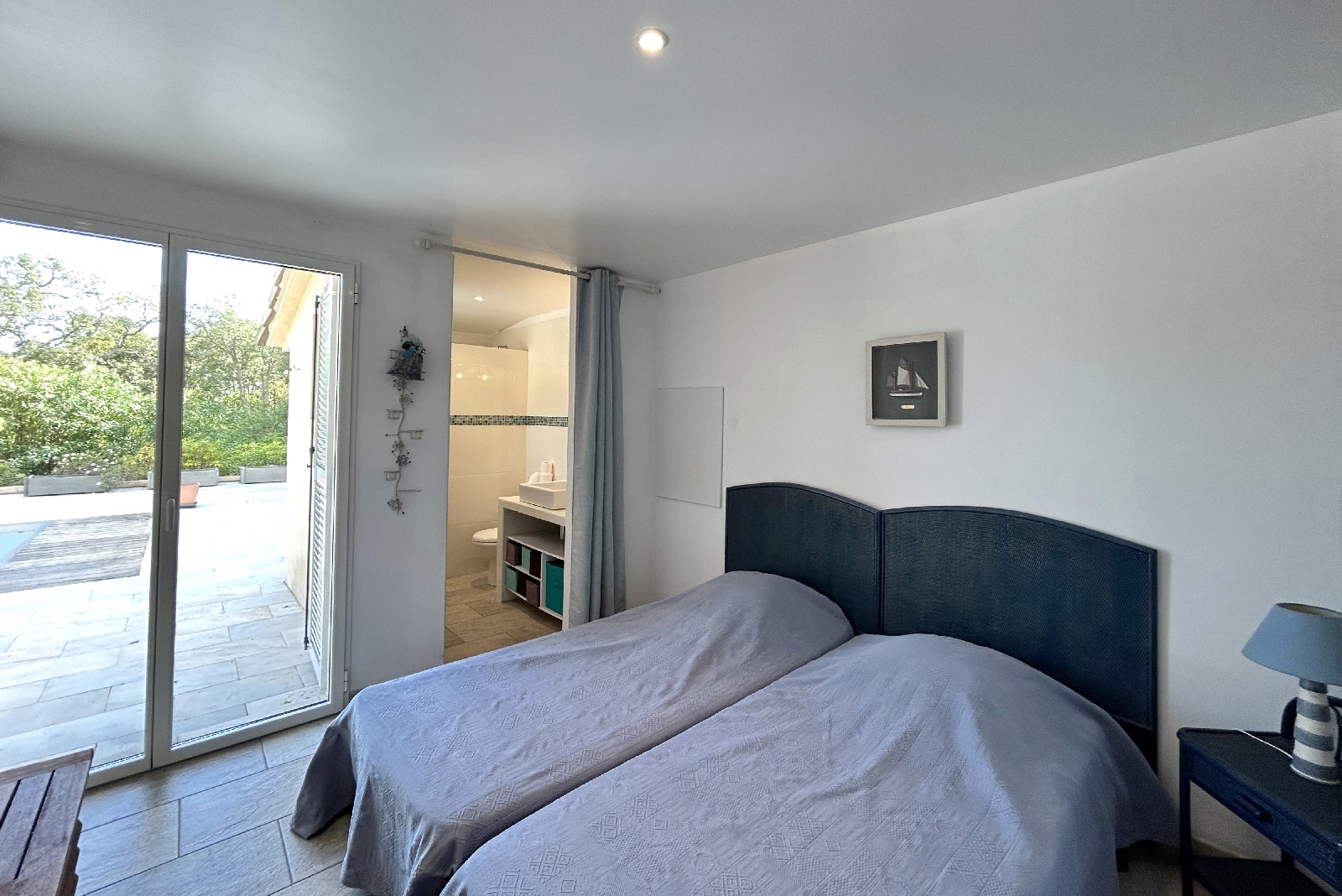 - En rez de jardin : Un salon / salle à manger, une cuisine à équiper, le tout ouvrant sur deux terrasses, l’une exposée plein nord équipée d’un four à pizza et d’une douche extérieure, la seconde exposée plein sud avec un aperçu mer et prolongée d’une piscine de 6 x 4 m. Une suite parentale avec chambre, salle d’eau et wc, un dégagement, une chambre ouvrant sur terrasse sud avec salle d’eau et wc, une chambre ouvrant sur terrasse nord, une salle d’eau indépendante avec wc.