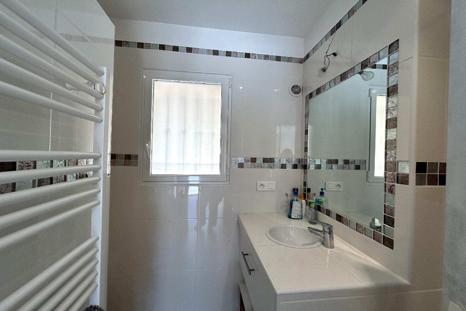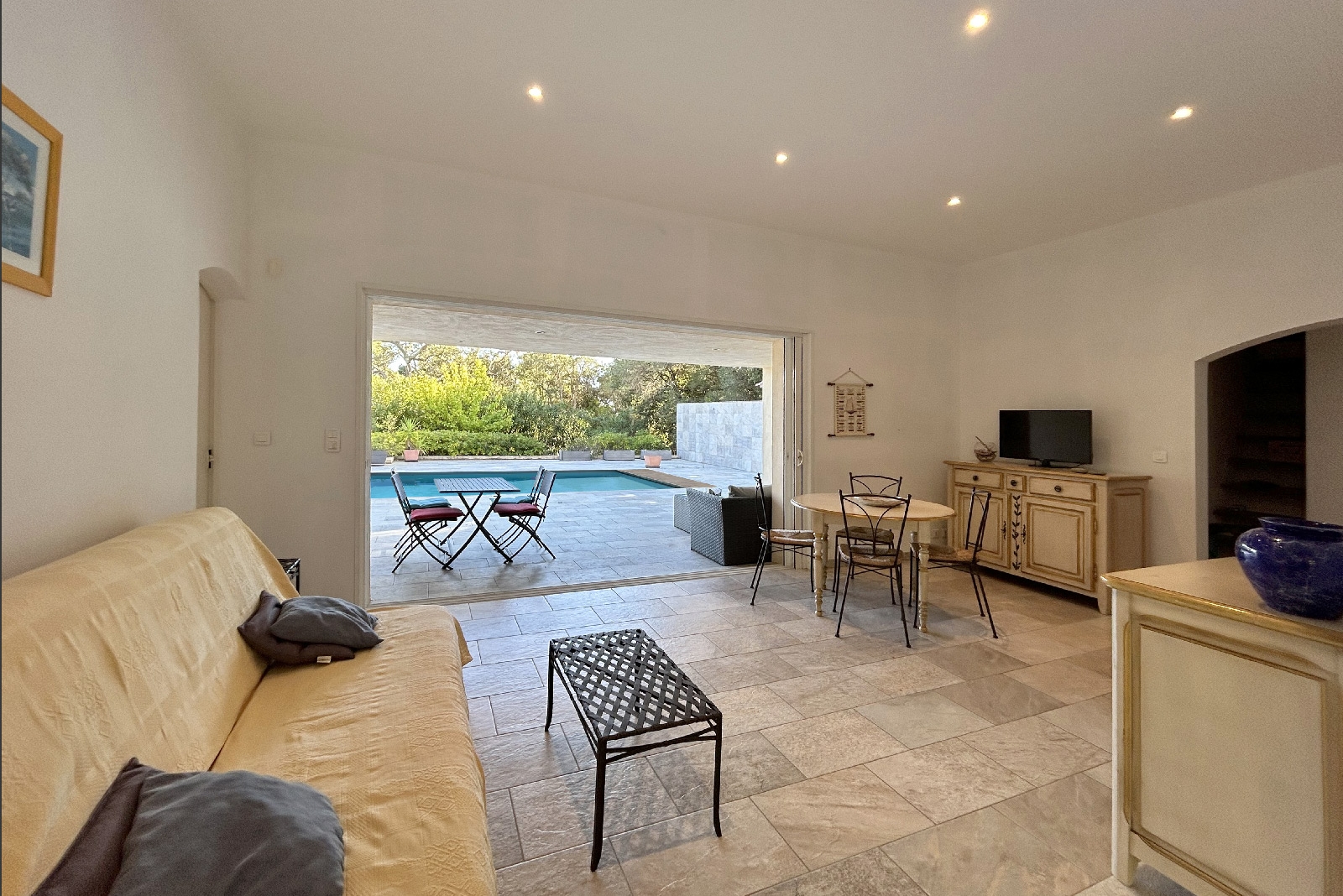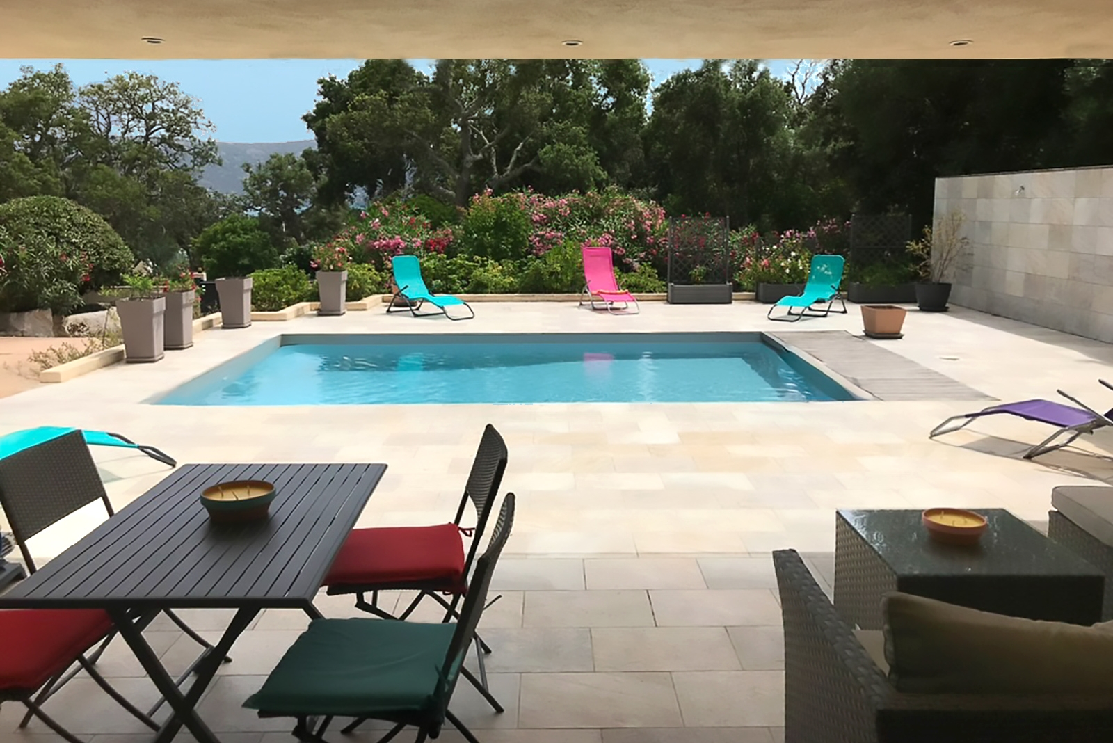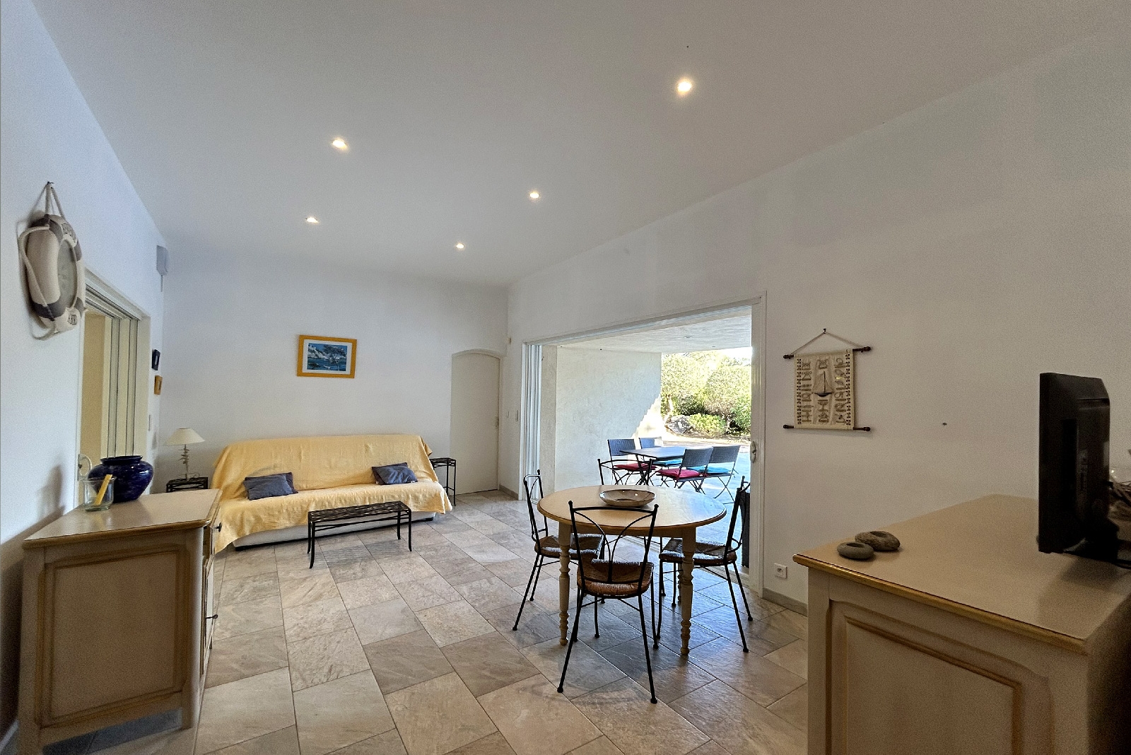 - En rez de jardin : Un salon / salle à manger, une cuisine à équiper, le tout ouvrant sur deux terrasses, l’une exposée plein nord équipée d’un four à pizza et d’une douche extérieure, la seconde exposée plein sud avec un aperçu mer et prolongée d’une piscine de 6 x 4 m. Une suite parentale avec chambre, salle d’eau et wc, un dégagement, une chambre ouvrant sur terrasse sud avec salle d’eau et wc, une chambre ouvrant sur terrasse nord, une salle d’eau indépendante avec wc.