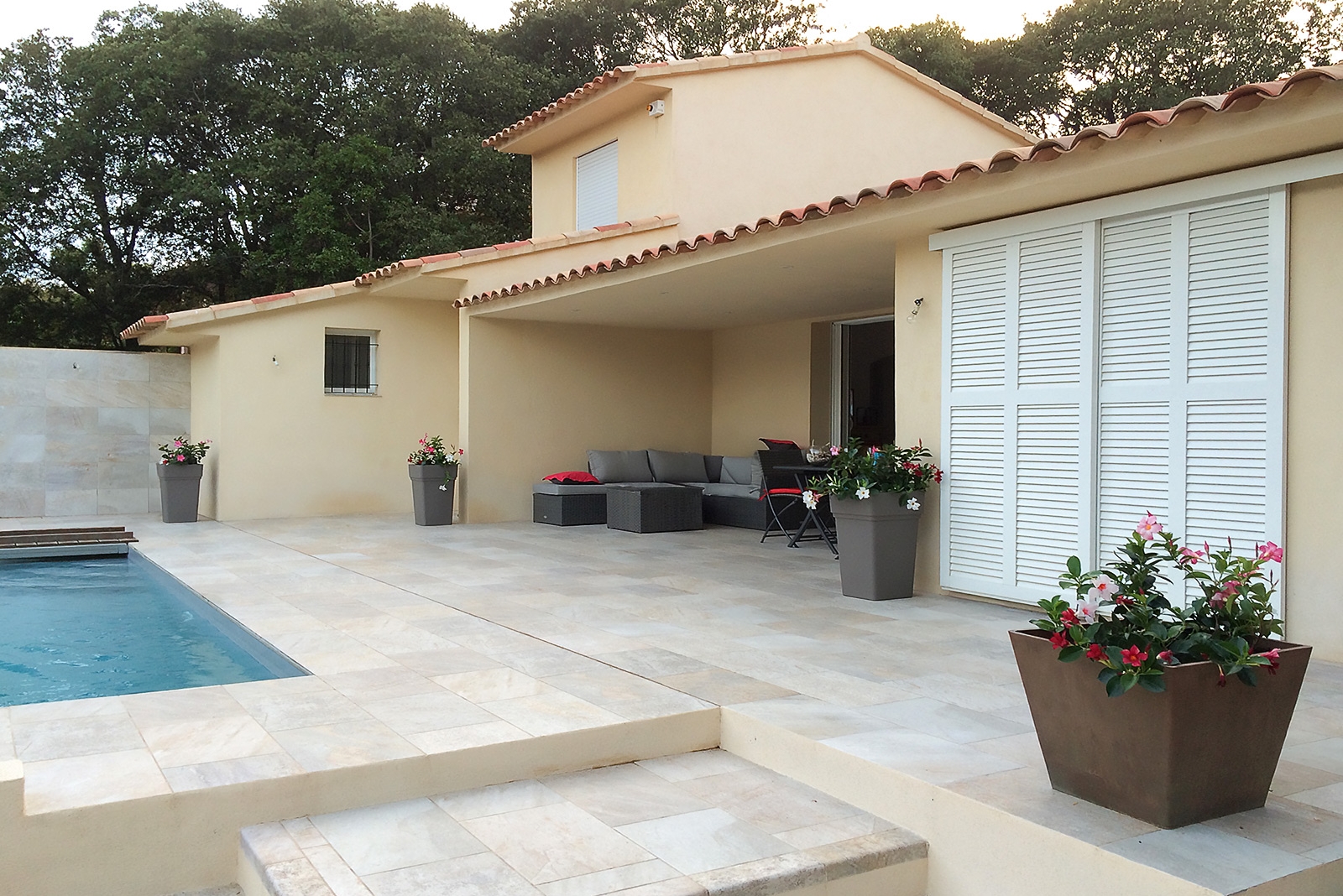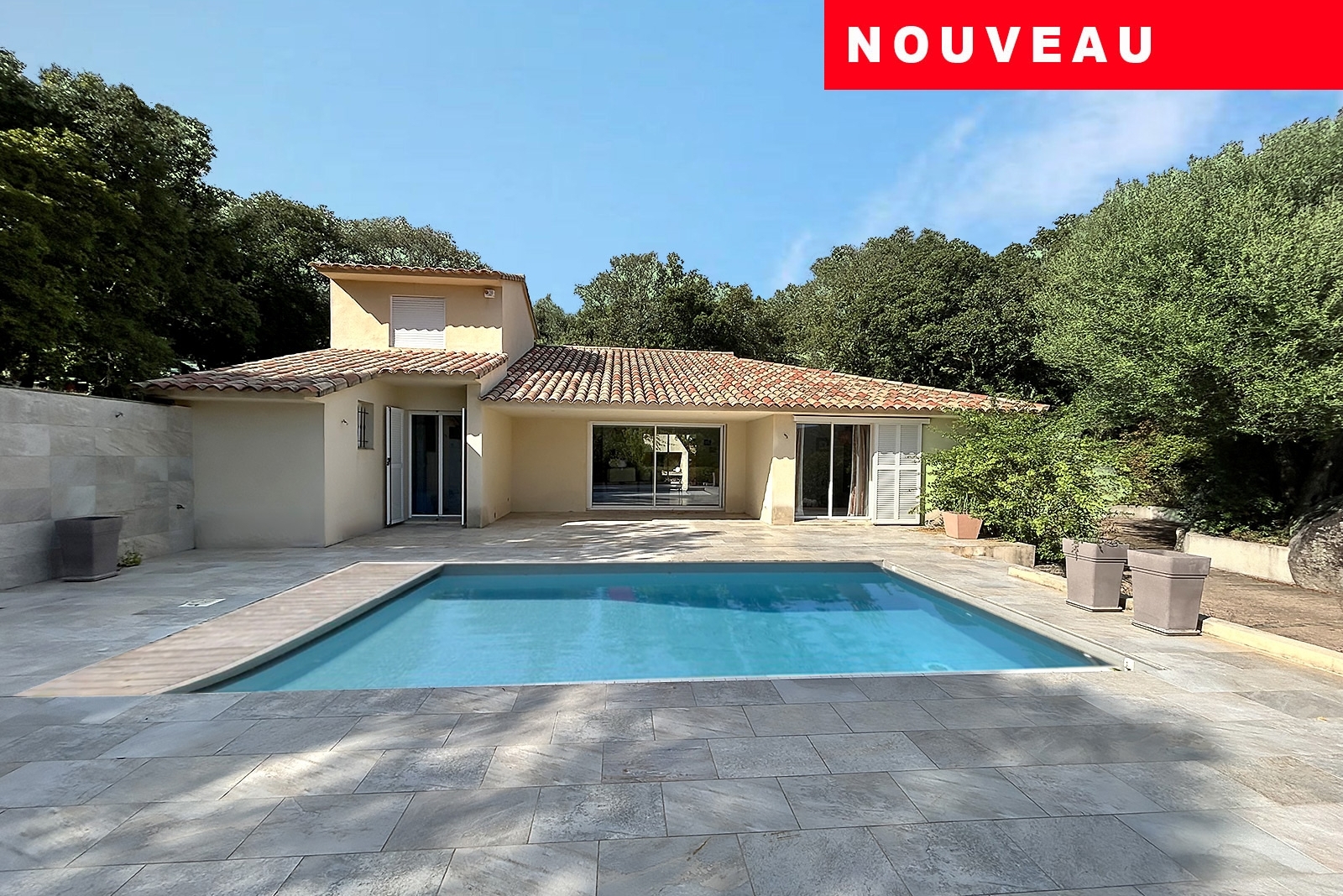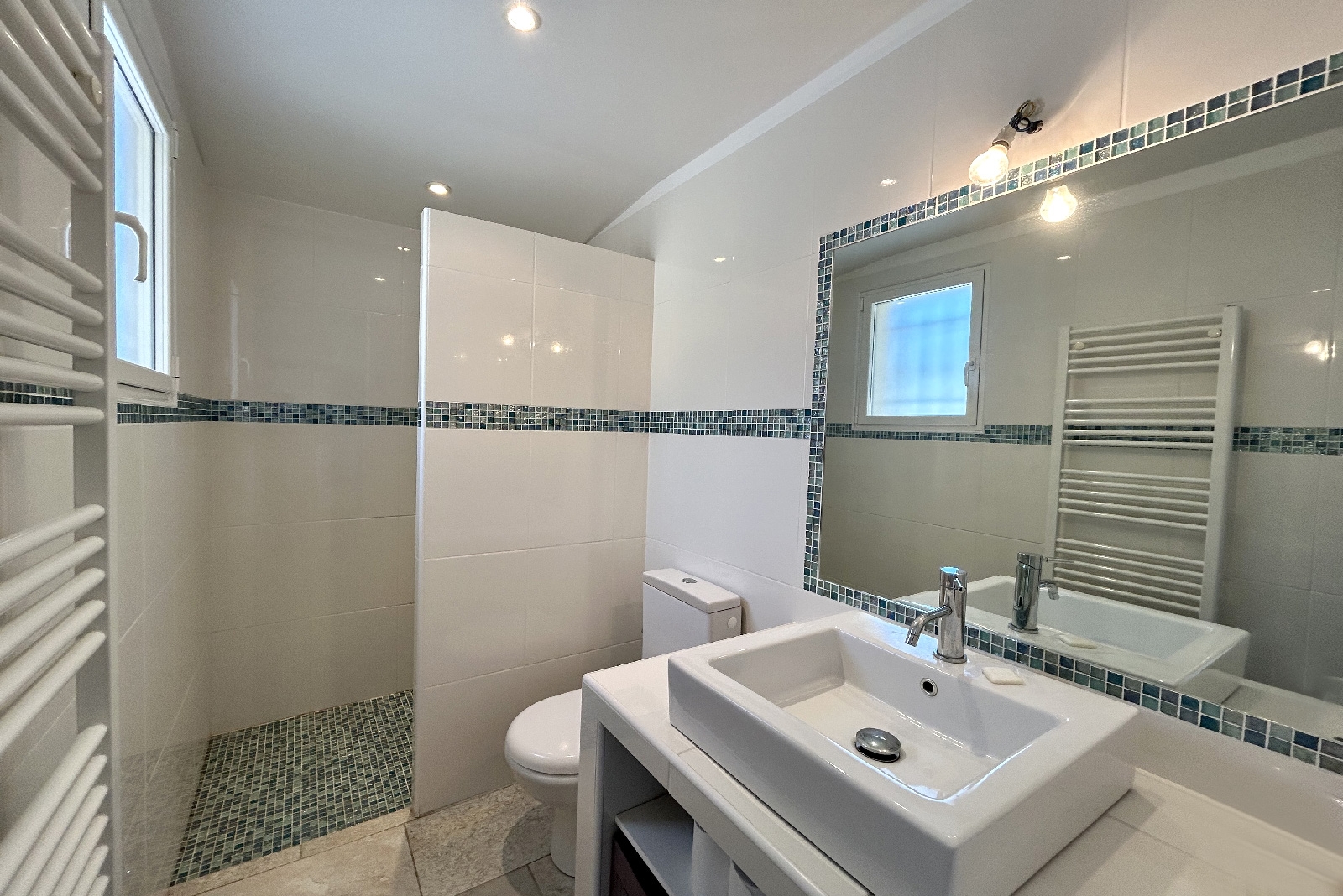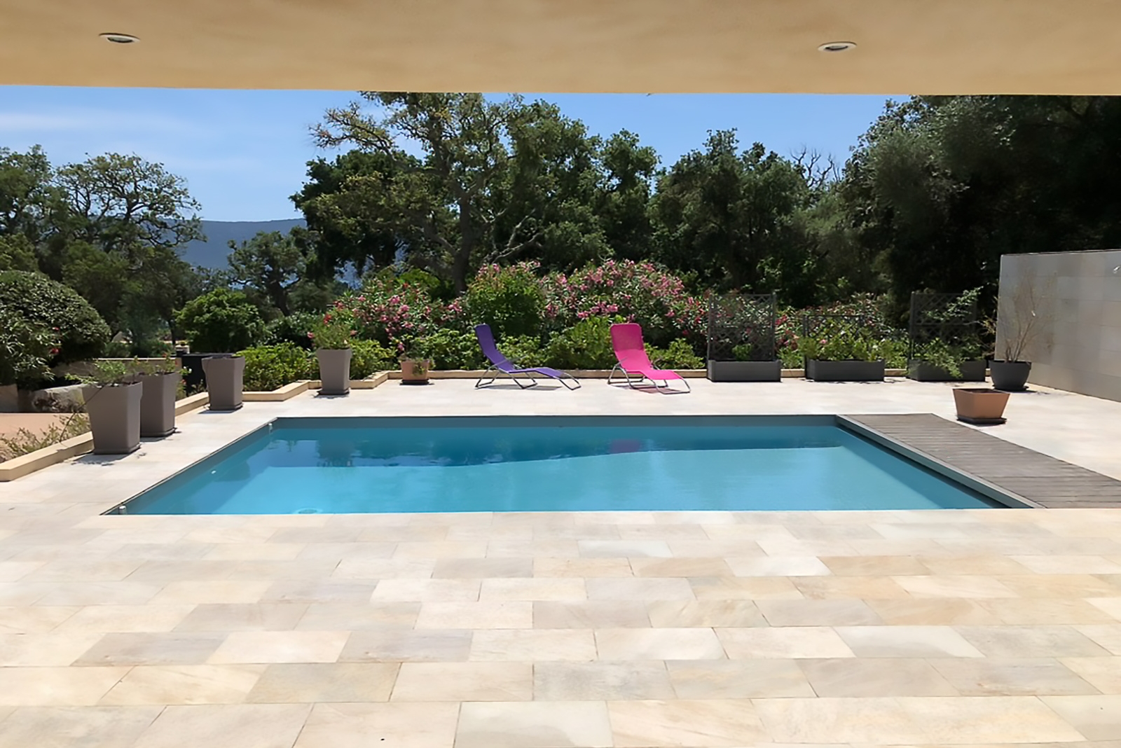- En rez de jardin : Un salon / salle à manger, une cuisine à équiper, le tout ouvrant sur deux terrasses, l’une exposée plein nord équipée d’un four à pizza et d’une douche extérieure, la seconde exposée plein sud avec un aperçu mer et prolongée d’une piscine de 6 x 4 m. Une suite parentale avec chambre, salle d’eau et wc, un dégagement, une chambre ouvrant sur terrasse sud avec salle d’eau et wc, une chambre ouvrant sur terrasse nord, une salle d’eau indépendante avec wc.